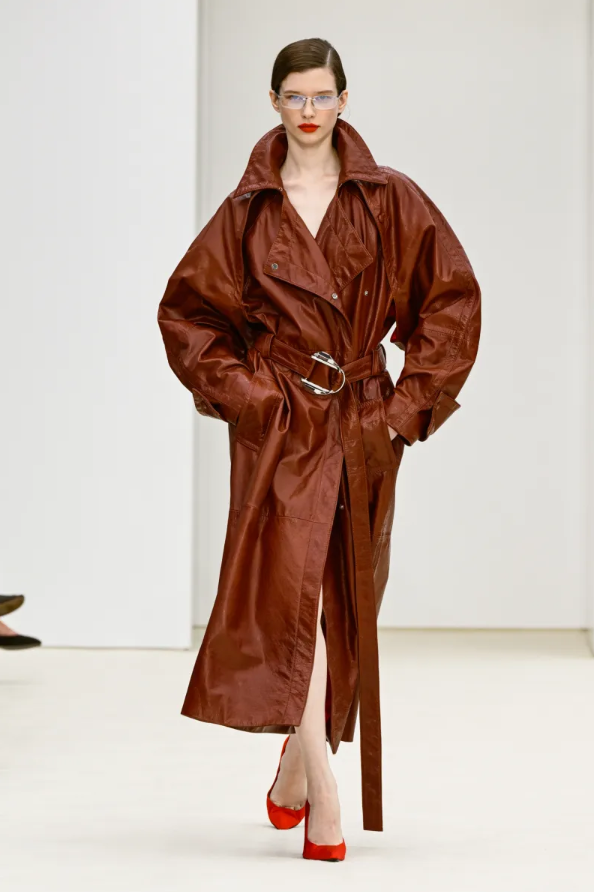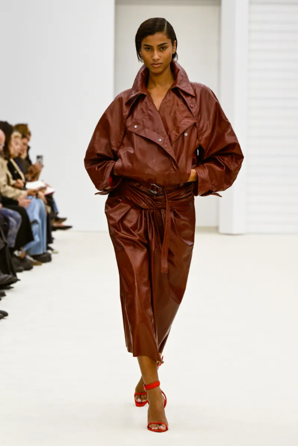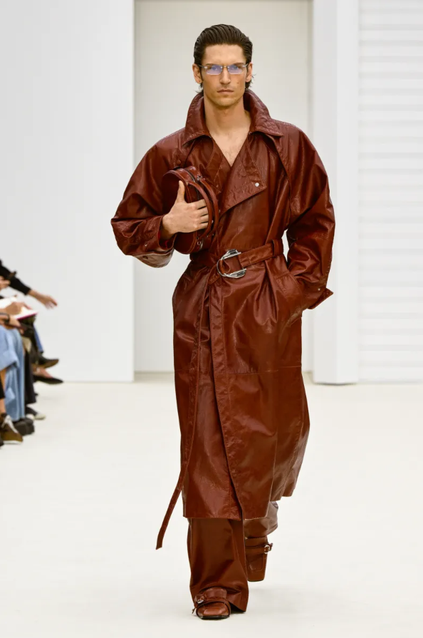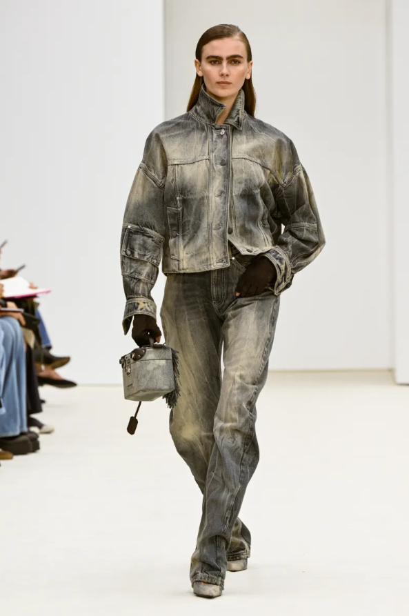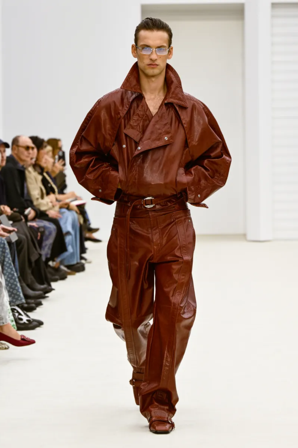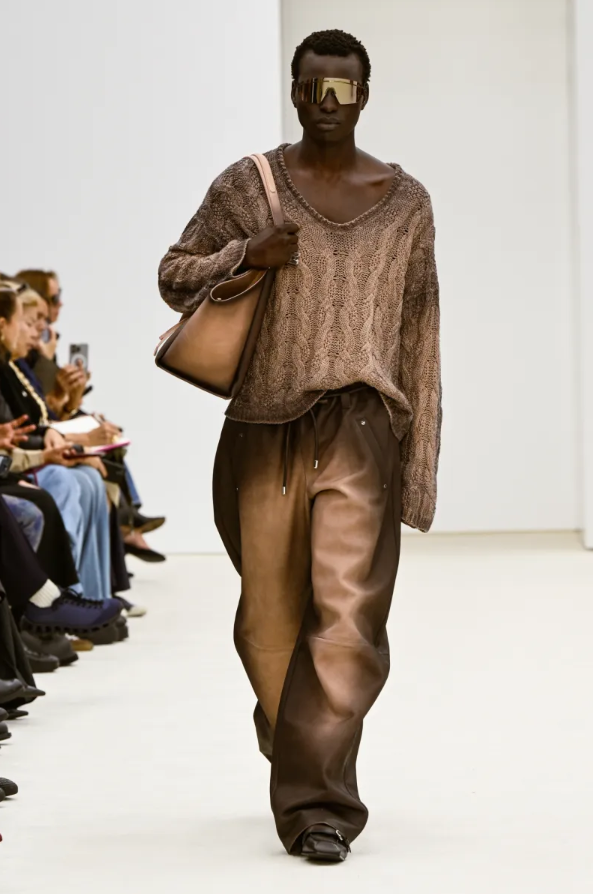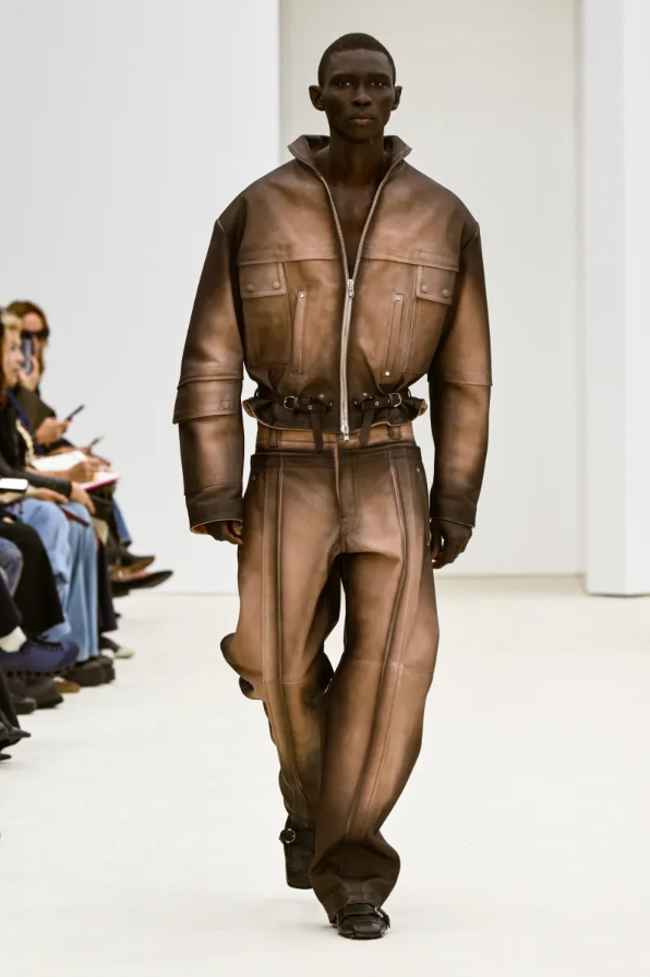 Notably, leather appears in soft, buttery Nappa forms rather than stiff showpieces; denim is acid-etched or airbrushed to highlight structure; knits are subtly textured rather than loud.