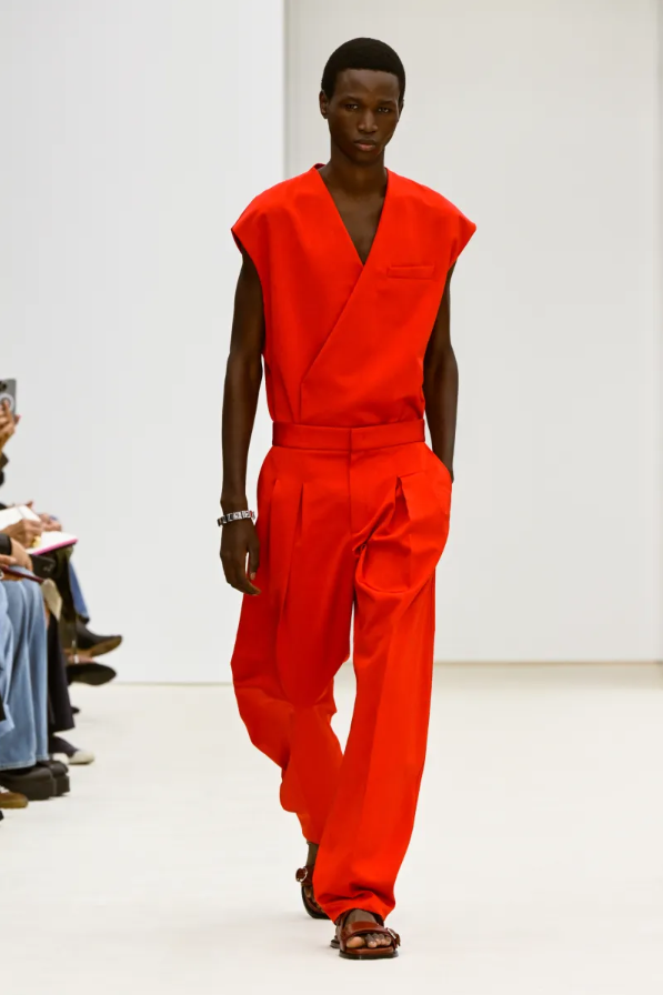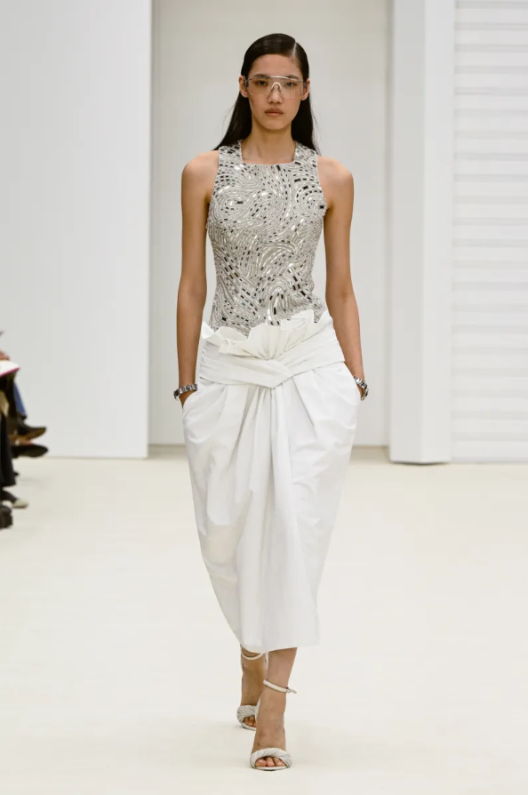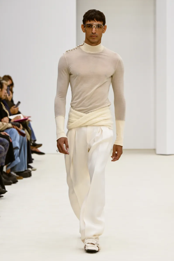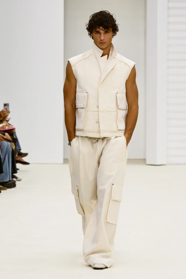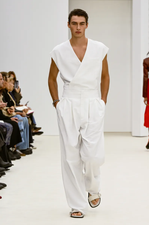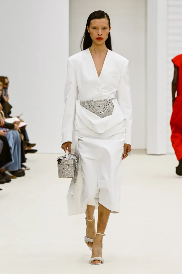 Ferrari’s SS26 avoids flamboyant prints in favor of a restrained palette. The foundation is white tones, from butter to optical whites, interspersed with rust, magma red, and accented earth tones. This minimal color strategy allows the cut, texture, and structure of garments to take center stage.