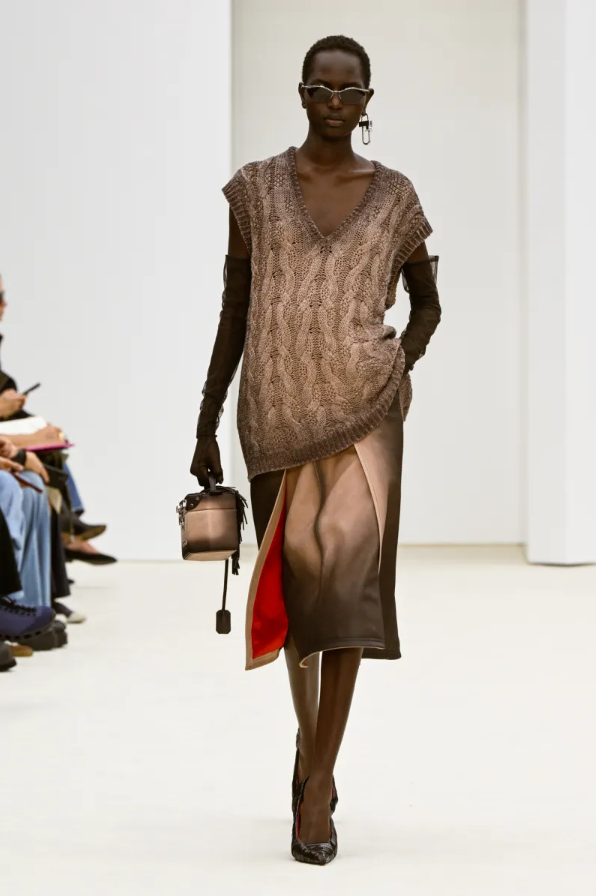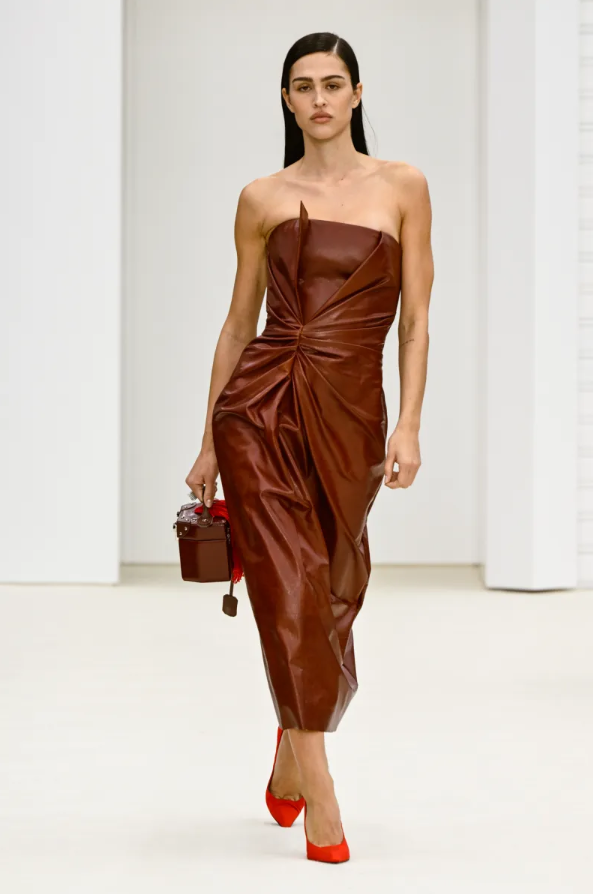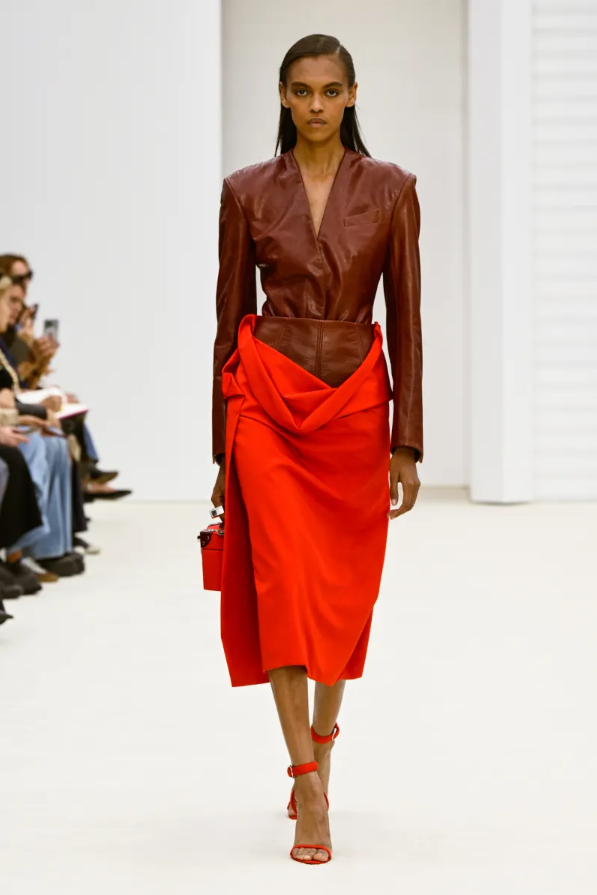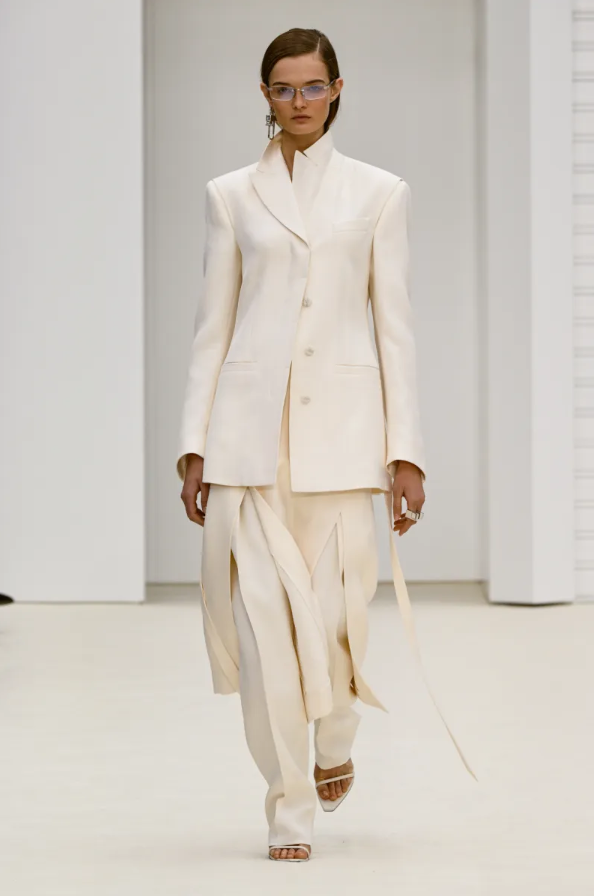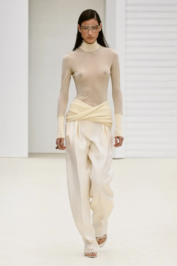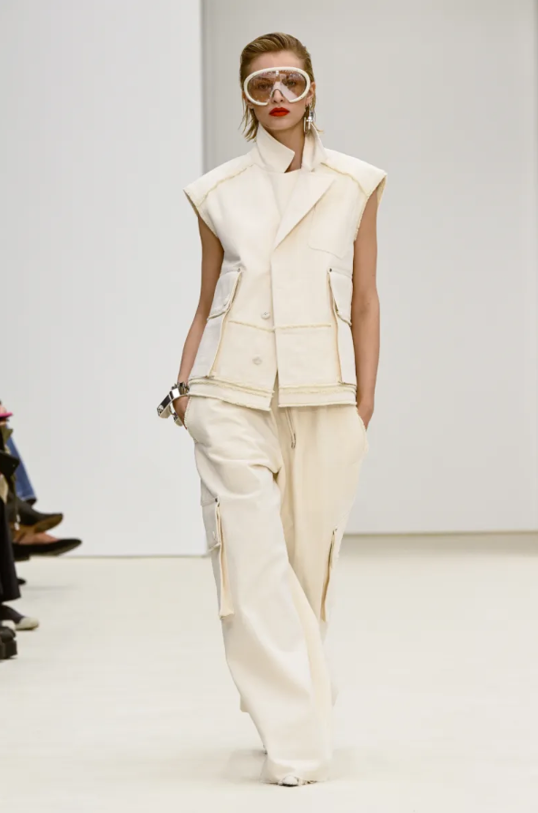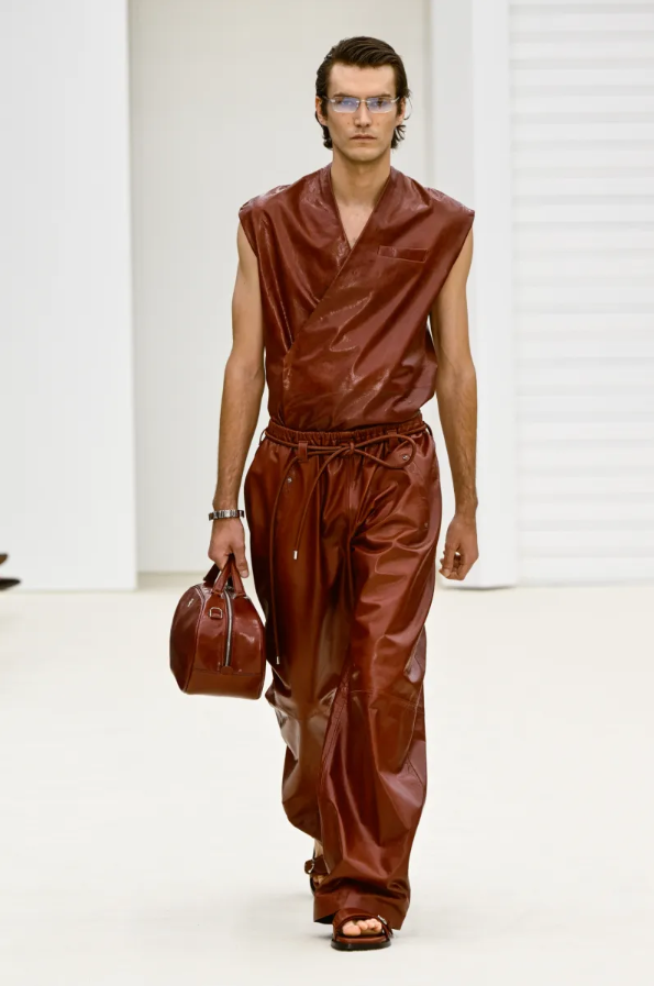 Ferrari’s SS26 avoids flamboyant prints in favor of a restrained palette. The foundation is white tones, from butter to optical whites, interspersed with rust, magma red, and accented earth tones. This minimal color strategy allows the cut, texture, and structure of garments to take center stage.