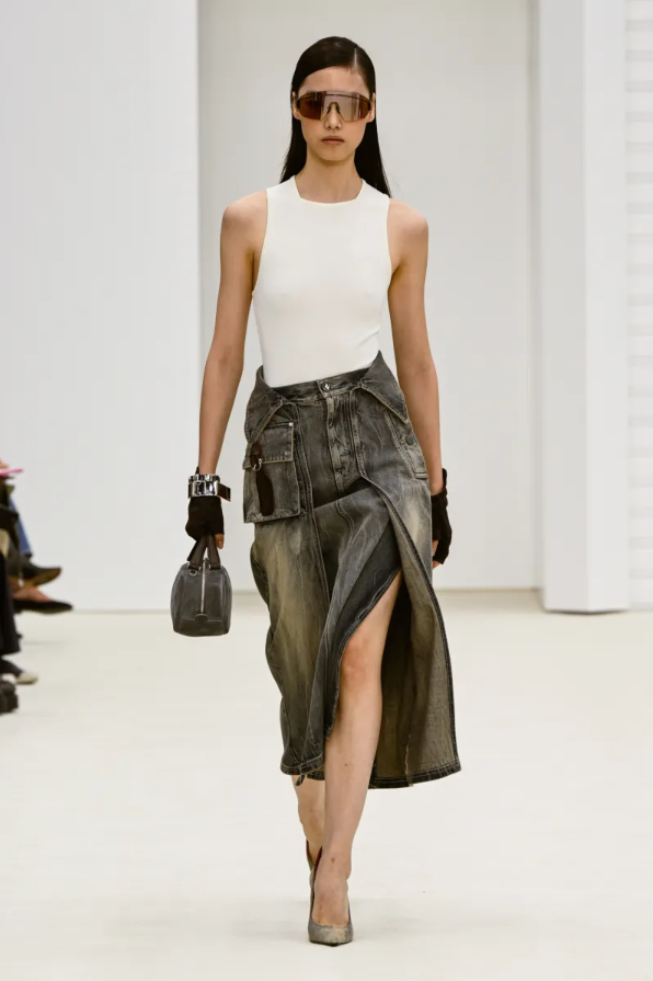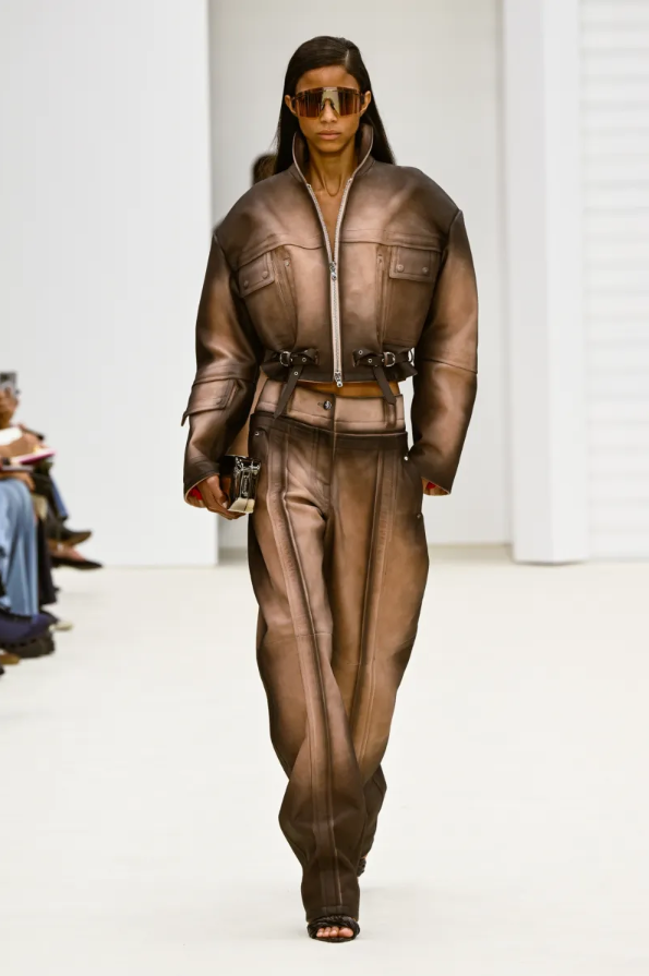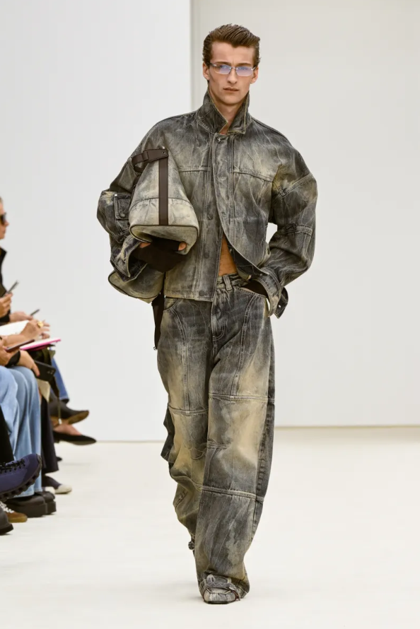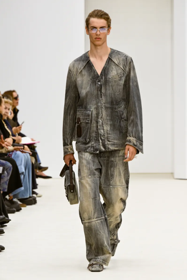 - The middle section introduces tension: sponged leathers, acid-etched denim, airbrushed knits, adding graphic contrast.
