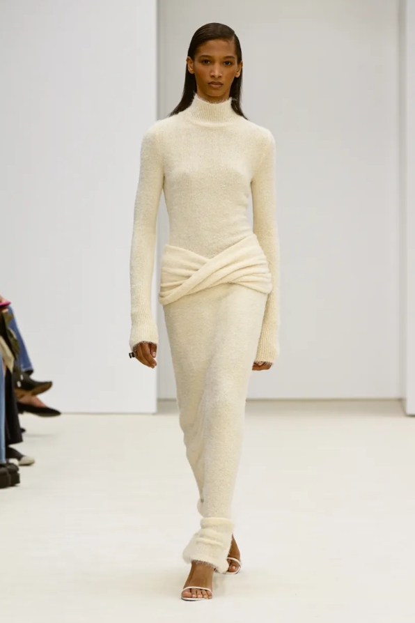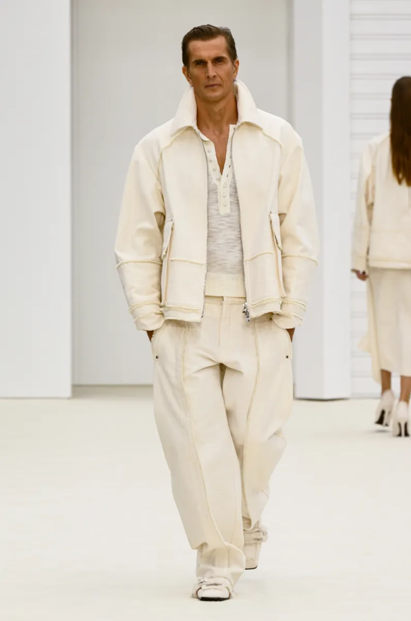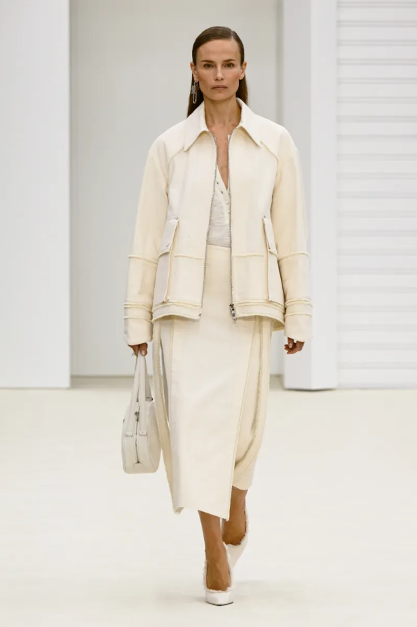 - The show opens with elongated dresses, fluid shirting, and relaxed tailoring, establishing a calm and pure mood.