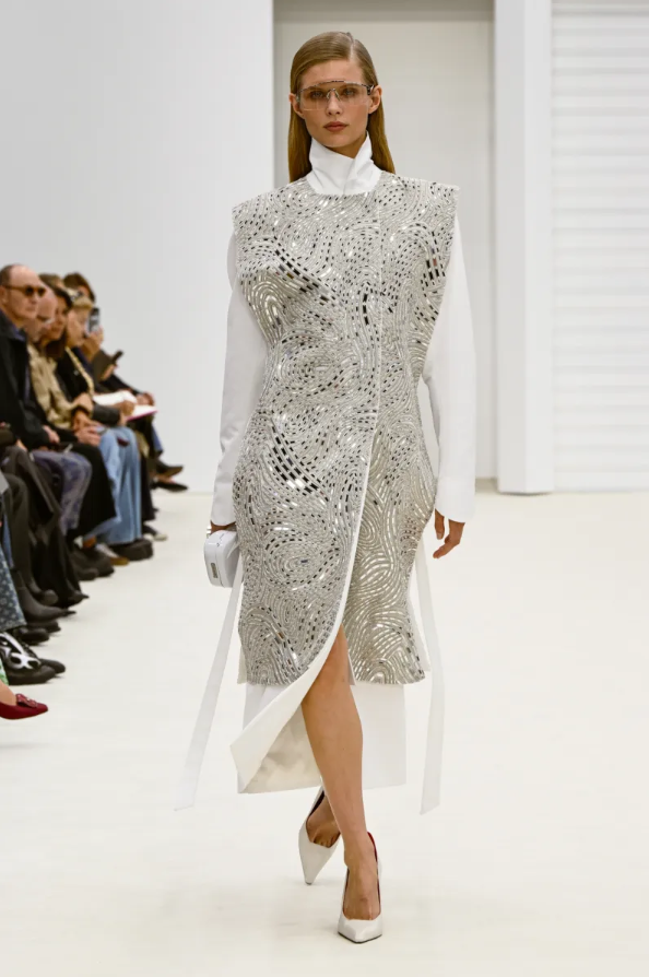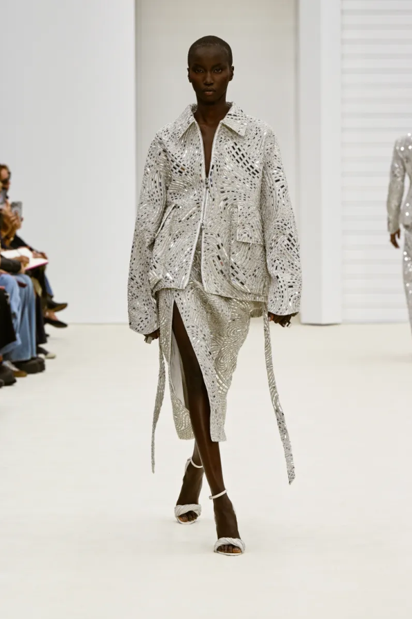 - The finale embraces sculptural fluidity: garments in silvery or light-reflective finishes that move like liquid in motion.
