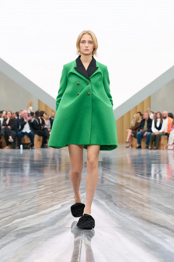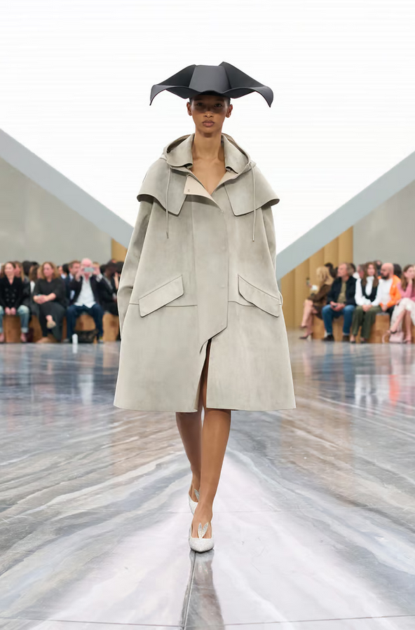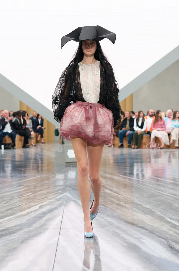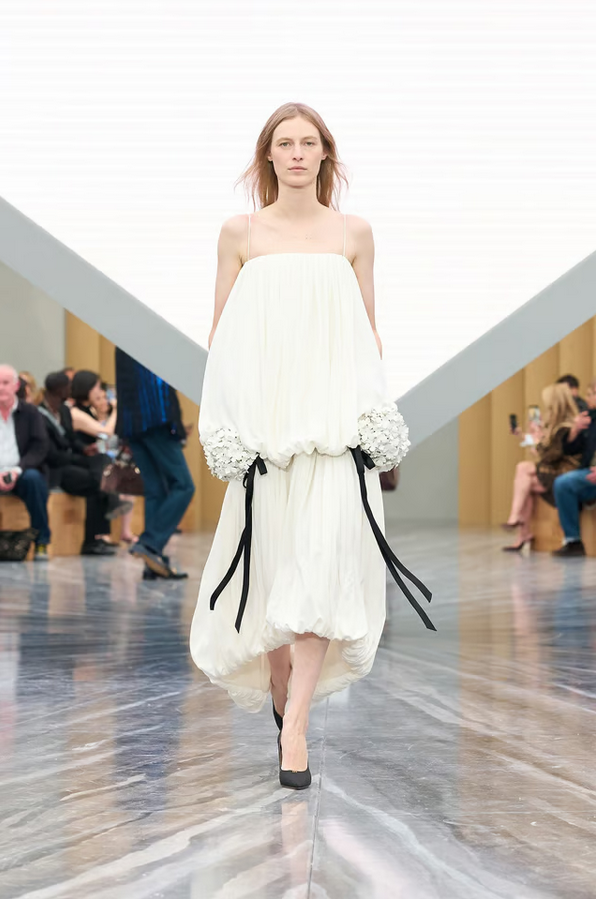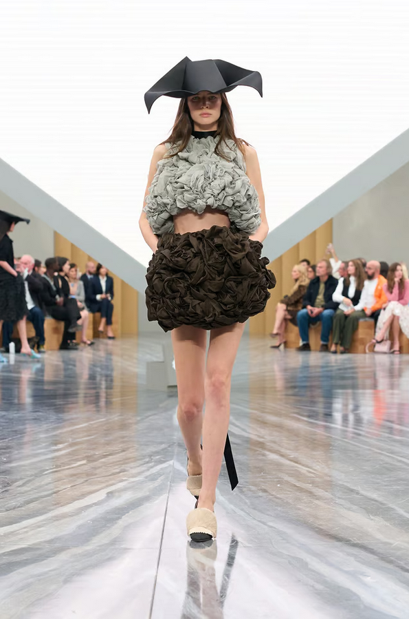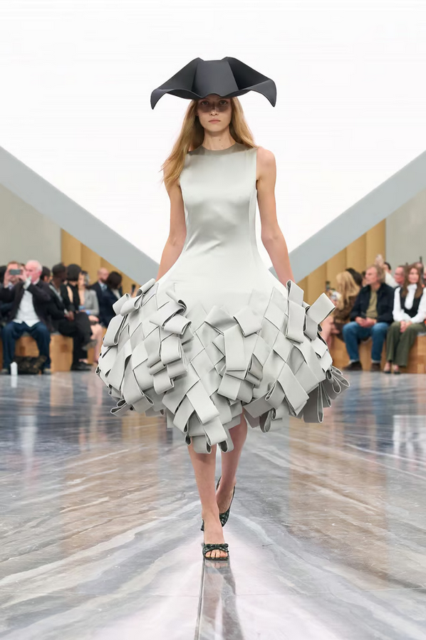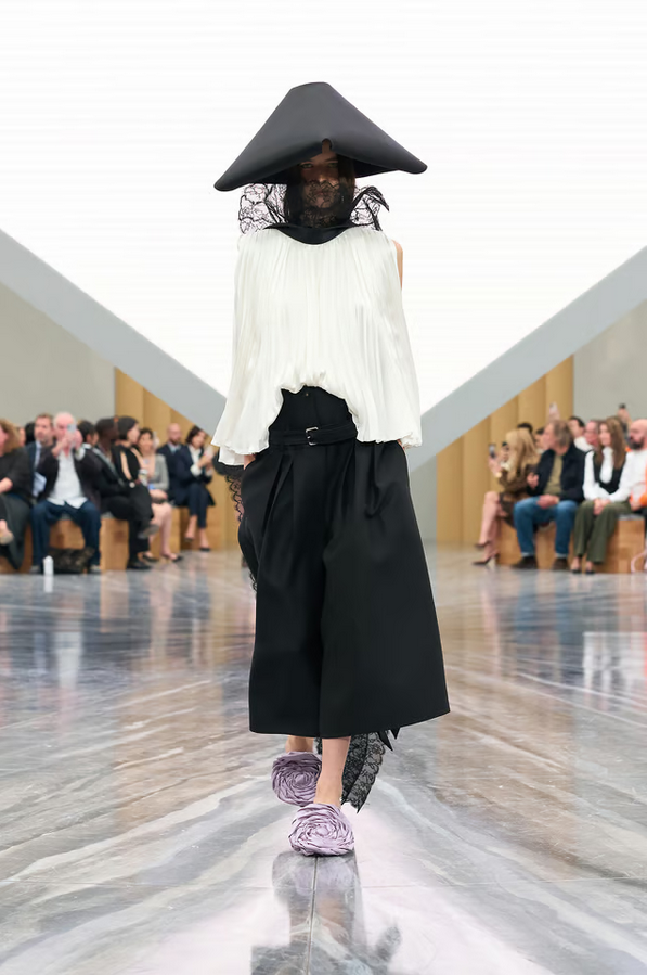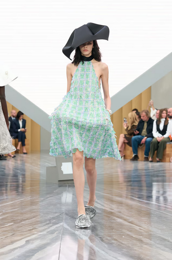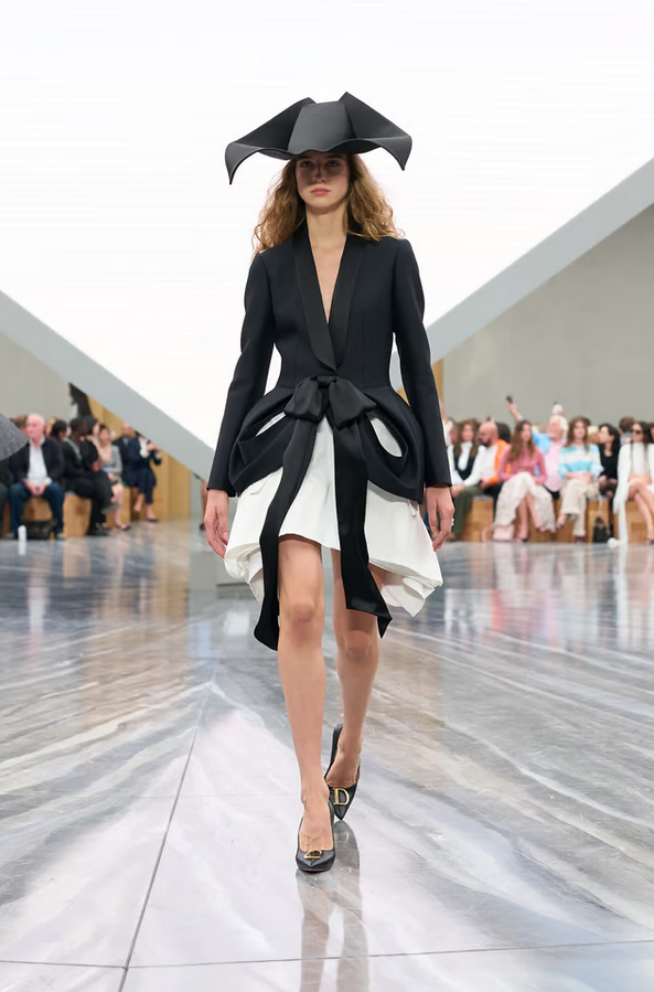 Accessories play a key role: bows in exaggerated scale, capelets, suspended florals in folds, and architectural hats mark standout moments. The cannage motif and hidden pockets in petals also add signature detail.