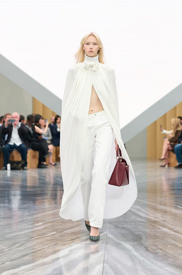 The palette moves between soft neutrals and expressive accents. Foundation tones of white, cream, and beige unfold into deeper hues like denim blue, leather black, and accent golds. Dior uses “sudden ruptures” of contrast to punctuate the collection.