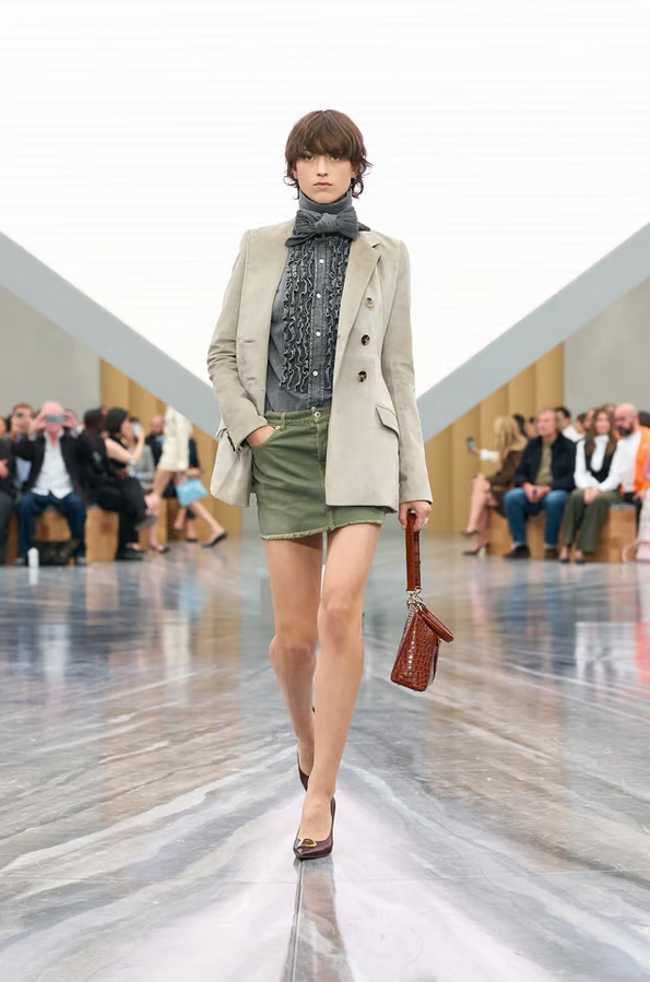 Dior pairs micro-minis in leather or denim with full skirts, or structured jackets with sheer overlays. These contrasts create visual tension — a hallmark of Anderson’s debut.