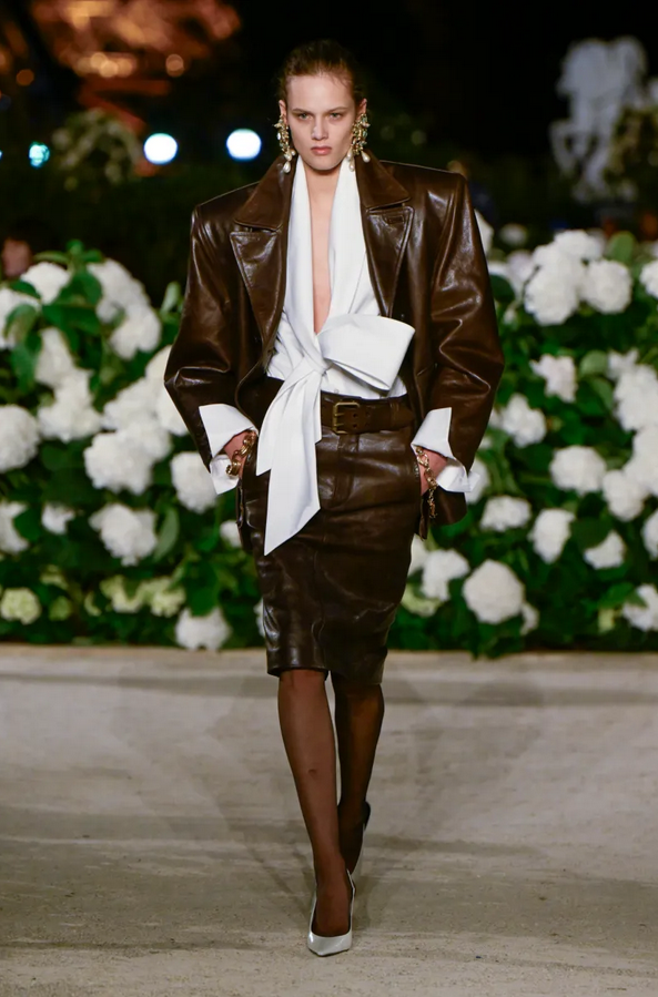 YSL reintroduces power shoulders in blazers and coats, sometimes exaggerated in scale.