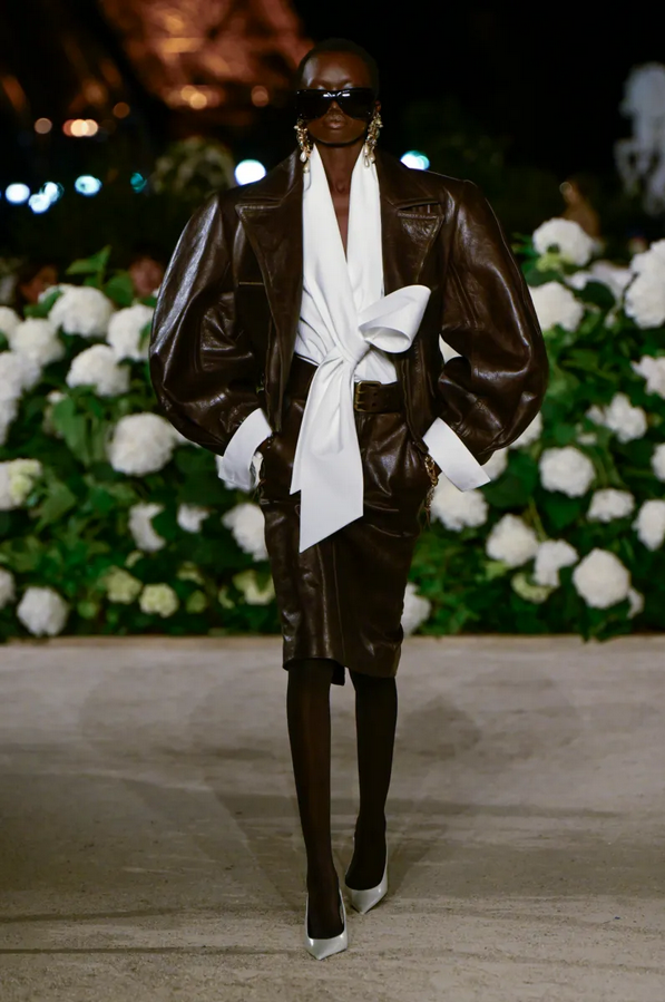 Saint Laurent’s Spring/Summer 2026 collection was presented outdoors with the Eiffel Tower as backdrop, in a grand, cinematic staging.