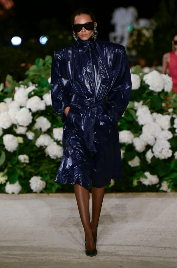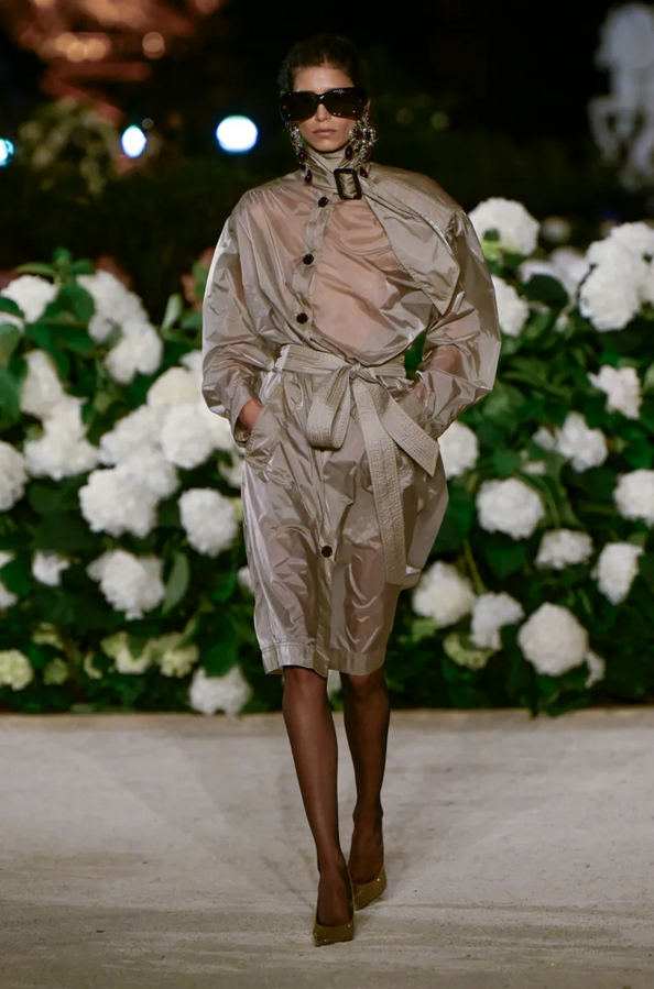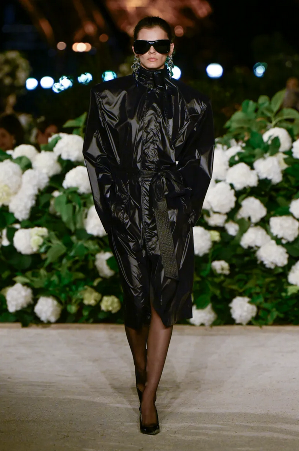 The collection is deeply anchored in Saint Laurent codes: trench coats, tuxedo jackets, sheer overlays, layered robes, nylon dresses. Yet Vaccarello injects contrast — sensual exposure, fluid volumes, and architectural drama.