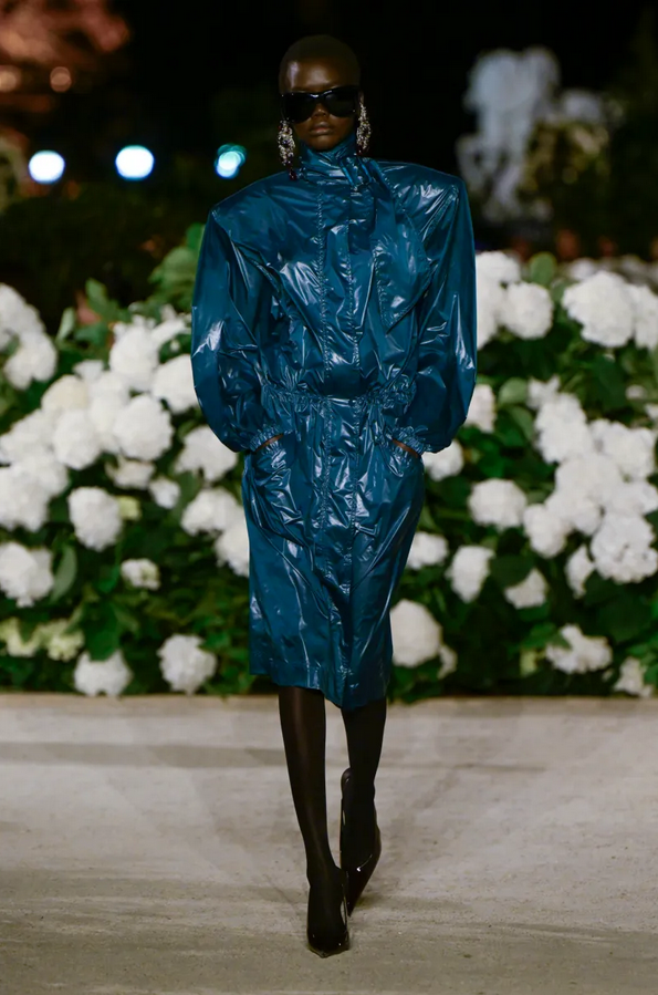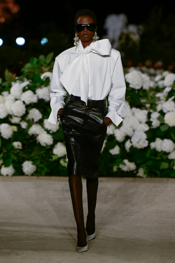 The runway deck was framed by banks of white hydrangeas forming the YSL logo, an ambitious gesture blending brand heritage and spectacle.