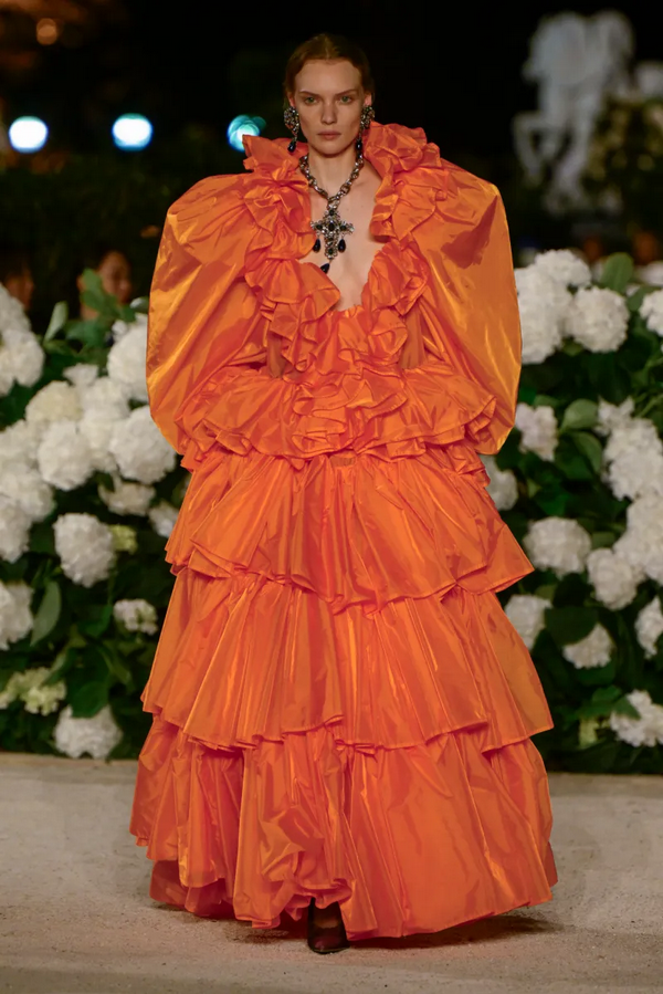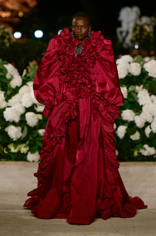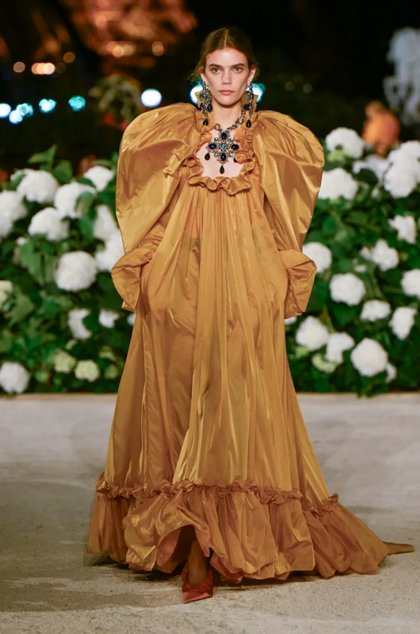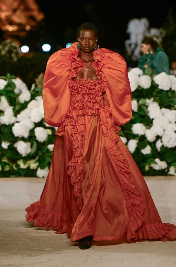Evening gowns in sheer fabrics ripple like water; ruffles and volumes evoke historic references, but crafted in modern materials.