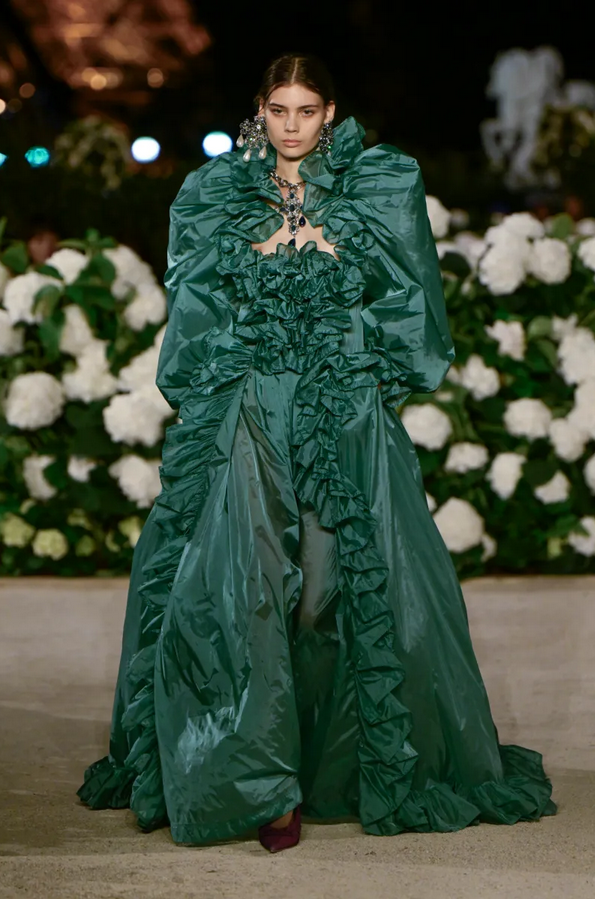 - Ruffles, pleats & volume: The use of volume, flounces, cascading skirts, and fluid drapery gives romantic tension.