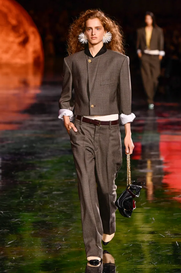 The show was staged dramatically under a celestial motif: planets suspended above the runway and reflective surfaces, evoking a cosmic ambiance.