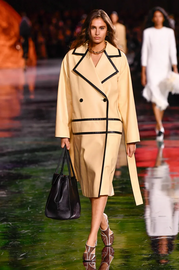 • Jersey and silk appear as fluid underlayers, softening structural outerwear.