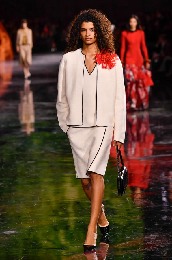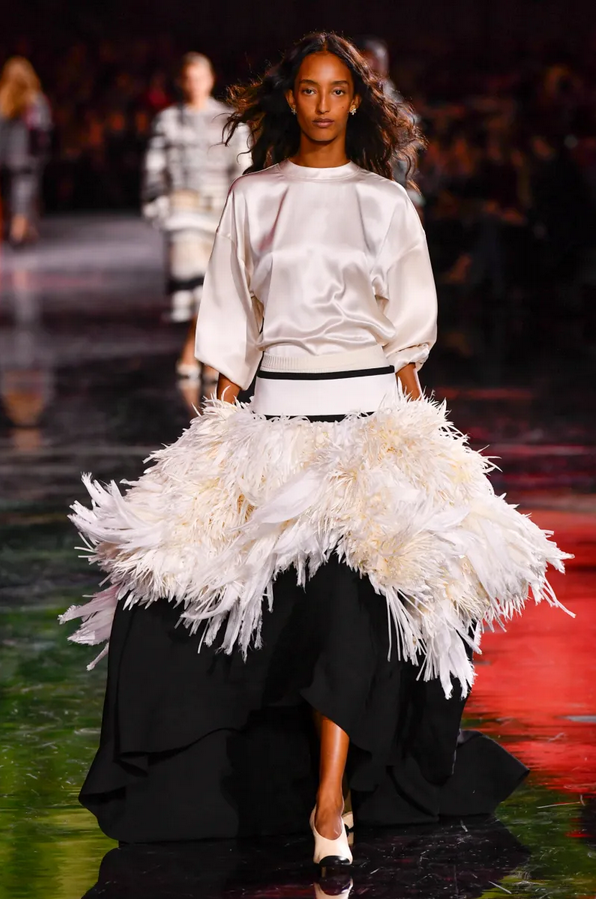 Chanel SS26 plays with neutral foundations — ivory, beige, black — punctuated by richer accents and contrasts.
