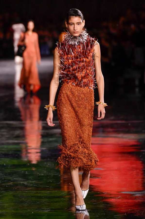• Feathered skirts, orbital chain details, architectural hems: emphasize motion, weightlessness, and a celestial narrative.